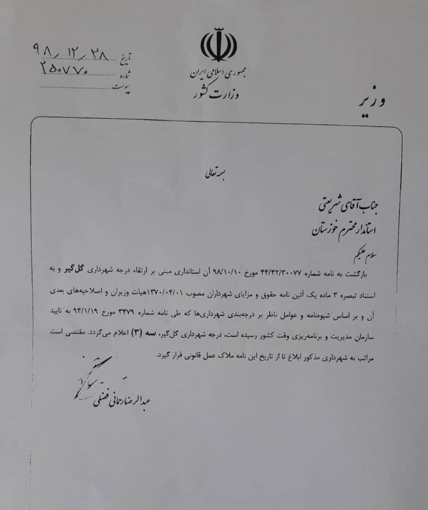 به گزارش خبرگزاری سیماش، سلیمان آقابیگی شهردار گلگیر با اعلام خبر فوق عنوان کرد: ارتقاء درجه شهرداری ها به استناد تبصره ۳ ماده یک آیین نامه ها «حقوق و مزایای شهرداران» مصوب اول تیرماه ۱۳۷۰ هیئت وزیران و اصلاحیه های بعدی آن و براساس شیوه نامه ها و عوامل ناظر بر درجه بندی شهرداری ها […]