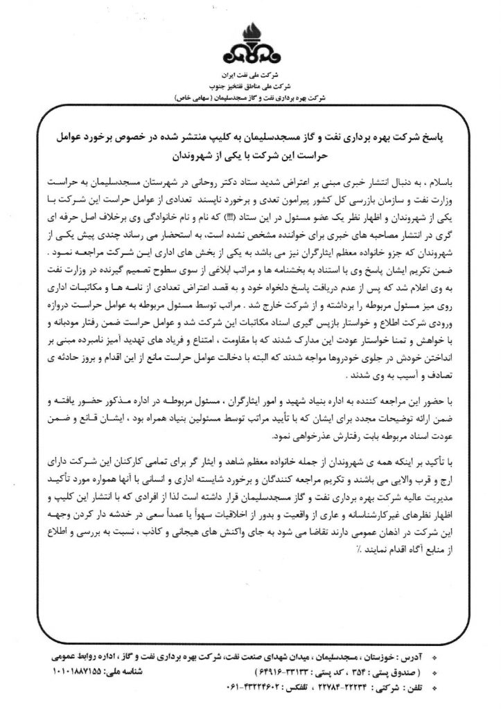 پاسخ شرکت بهره برداری نفت و گاز مسجدسلیمان به کلیپ منتشر شده درخصوص برخورد عوامل حراست این شرکت با یکی از شهروندان